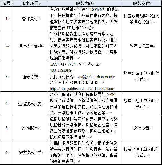 維保周期內(nèi),金(jīn)科(kē)信息為(wèi•)用(yòng)戶提供的(de)硬件(jiàn)維保服£↓÷務的(de)主要(yào)服務內(nèi)容如(rú)下(xià):