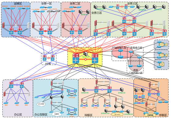 1. 網絡建設需求 1)支持業(yè)務快(kuài)速接入和(hé)業(yè) ™務連續的(de)“兩地(dì)三中心” ♦ 重要(yào)業Ω↔>(yè)務系統“雙活”; ♦ 在不(bù)啓動災備流程的(de)♥↔'前提下(xià),能(néng)實現(xiàn)單個(g¥<♠≈è)業(yè)務系統在同城(chéng)中心間(jiān)的(de)切換;↑ ♦✔¶ 滿足新上(shàng)業(yè)務系統的(de)擴容需求,支持某銀(yín)行(xí ±&ng)業(yè)務的(de)快(kuài)速發展,網絡具₽★≥$備業(yè)務感知(zhī)能(néng)力。 2)廣域網 ♦ 滿足分 λ®&(fēn)支機(jī)構、各業(yè)務中心的(de✔Ω♠×)擴張和(hé)快(kuài)速接入; ♦ 一(yī)個(gè)整體(tǐ)≈↔£'廣域網平台,支持多(duō)業(yè)務共存(各種業(yè)務、VTM、視(shì)頻(pín)、€∑語音(yīn)等)的(de)需求。 3)網絡安全 ♦ 結合已經建立的(de)安↔♣全域體(tǐ)系,實現(xiàn)網絡分(fēn)區(qū)規劃; ♦ 滿足虛拟化(huà)環境下(xi≈×à)的(de)安全要(yào)求; 4)網絡管理(lǐ); ♦ 構建獨立的(₽φβde)ECC管理(lǐ)網絡,并結合安全域的(de)維度做(zuò)隔離(lí)。 2. 總體(tǐ)架構拓撲示意圖 網絡結構按照(zhào)分(fē☆ n)層結構和(hé)模塊化(huà)方式進行(xíng)設計<α(jì)。網絡設計(jì)整體(tǐ)采用(yòng)核心層、分(fēn)布層、接入網的(d→Ω¶e)層次化(huà)結構;網絡分(fēn)層設計(jì)優點在于網絡結構"☆> 清晰,管理(lǐ)運維方便簡單。 某銀(yín)行(xí₩>¶ng)網絡層級主要(yào)分(fēn)為(wèi)三層網絡:核心網、一™©≠∏(yī)級網和(hé)二級網。核心網作(zuò)為(wèi)整個(±•¶δgè)銀(yín)行(xíng)網絡的(de)核心層,用(yòng)于連接總行(xí≈✘∑ng)、一(yī)級分(fēn)行(xíng)、數(shù)據中心、開(σ↓εφkāi)發中心等一(yī)級分(fēn)支機(jī)構網絡。一(yī)級網作(zuò)為(wèi)☆↔>整個(gè)銀(yín)行(xíng)網絡的(de)分(fēn)布層,包♥←含總行(xíng)、一(yī)級分(fēn)行(xíng)、數(shù)據中心、開(kāi)發γ±中心等一(yī)級分(fēn)支機(jī)構。二級網作(zuò)為(wèi)整個(gè)銀(y£☆€ín)行(xíng)網絡的(de)接入層,包含各地(dì)區(qū)支行(xíng)、營業(y↕$ è)網點等末端機(jī)構。 數(shù)據中心網絡結構設計(jì)同樣遵循分↑♣₽(fēn)層和(hé)模塊化(huà)設計(jì)方式,整體(↔♣§tǐ)分(fēn)為(wèi)以下(xià)幾個(gè)區(qū)域:廣域網區(qū)☆≈、核心交換區(qū)、業(yè)務一(yī)區(qū)、∞Ω業(yè)務二區(qū)、業(yè)務三區(qū)、辦公區(qū)、辦公互聯區('♦♠©qū)、網銀(yín)區(qū)、外(wài)聯區(qγ>∑ū)、運維管理(lǐ)區(qū)和(hé)OTV區(qū)。 整體(tǐ)拓撲 €σ↕如(rú)下(xià):