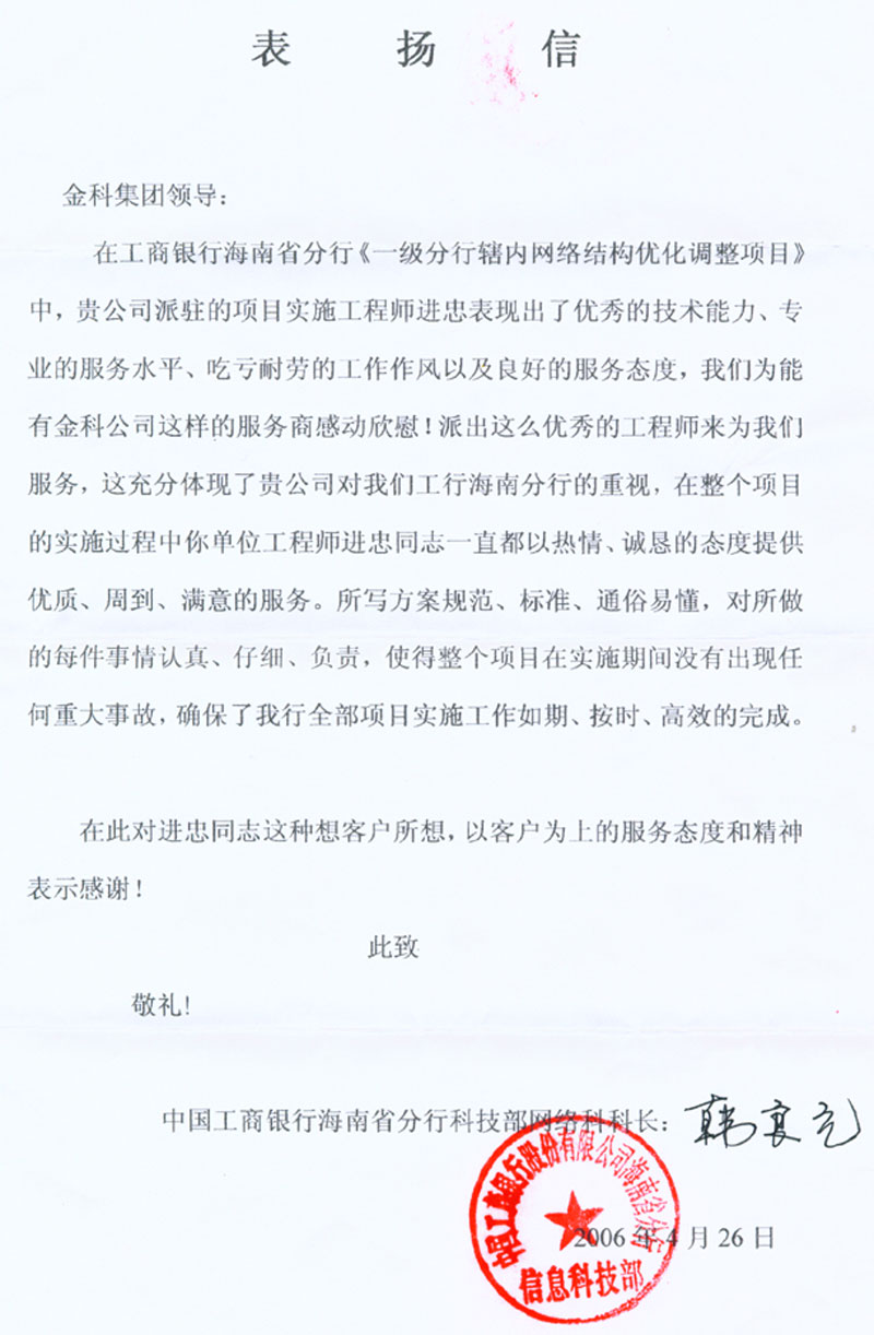 進忠于2005年(nián)1∞€≠↑2月(yuè)加入金(jīn)科(kē)大(dà)家(jiā)庭,在短(duǎn)短(¥ ® duǎn)五個(gè)月(yuè)的(de)時(shí)間(j₽β÷÷iān)裡(lǐ)他(tā)以優異的(de)工(gōng)作(zuò≤♥∏π)表現(xiàn)獲得(de)公司和(hé)客戶的(de)一(yī)緻好® ¶₩(hǎo)評。在工(gōng)商銀(yín)行(xíng)海(hǎi)南(nán)♠γ®λ省分(fēn)行(xíng)“一(yī)級分(fēn)行(xíΩ÷ng)轄內(nèi)網絡結構優化(huà)調整項目”δ≥中,他(tā)表現(xiàn)出來(lái)的(de→€✔¶)敬業(yè)、執著(zhe)、勤奮,獲得(de)客戶的(de)書(shū)面表揚。>₹₹§ 附:表揚信