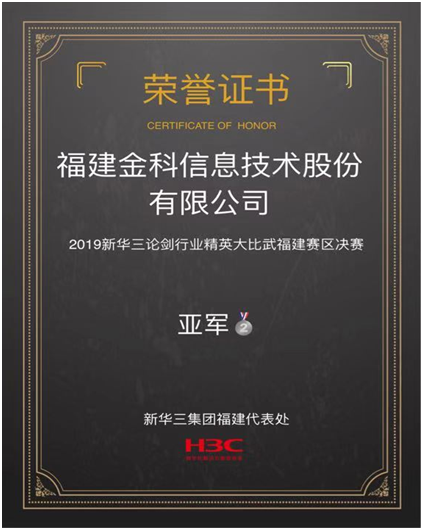 2019年(nián)9月(yuè)26日(rì),一(yī)年(n£'¶←ián)一(yī)度的(de)“新華三論劍行(xíng)業(yè)精英大(d♠π§♠à)比武福建賽區(qū)海(hǎi)選決賽”于鉑爾曼酒店(diàn)落幕。作(zu₹≠¥ò)為(wèi)新華三的(de)重要(yào)合作(zγ&× uò)夥伴,我司指派銷售經理(lǐ)吳麗(lì)貞、林(lín)建,技(jε±♠ì)術(shù)部工(gōng)程師(shī)黃(hu₽↑'•áng)斌、葉欣四人(rén)組隊代表金(jīn)科(kē)參賽。φ↔∞"筆(bǐ)試環節以第六名成績進入決賽後,經過短(duφ♦←₹ǎn)時(shí)間(jiān)內(nèi)的(de)精心準備、模φ 拟練習(xí),參賽隊員(yuán)通(tōng)過積極尋求內(nèi)外(wài)≤₹部資源,以及參賽過程中的(de)默契配合,最終在決賽中取得(de)福建賽✘÷₩區(qū)亞軍的(de)好(hǎo)成績。