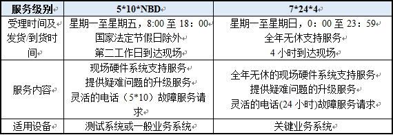 針對(duì)硬件(jiàn)維保,金(jīn)科(kē) 信息提供兩種服務級别,具體(tǐ)如(rú)下(xià)表所示: